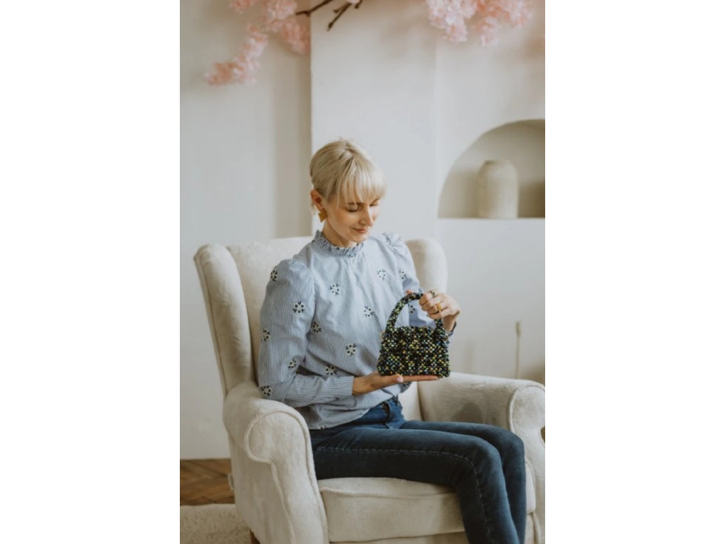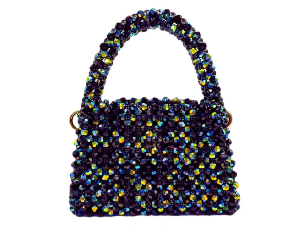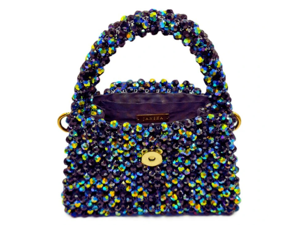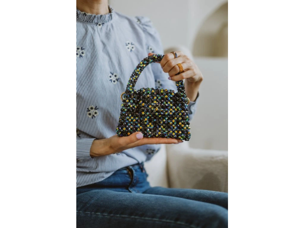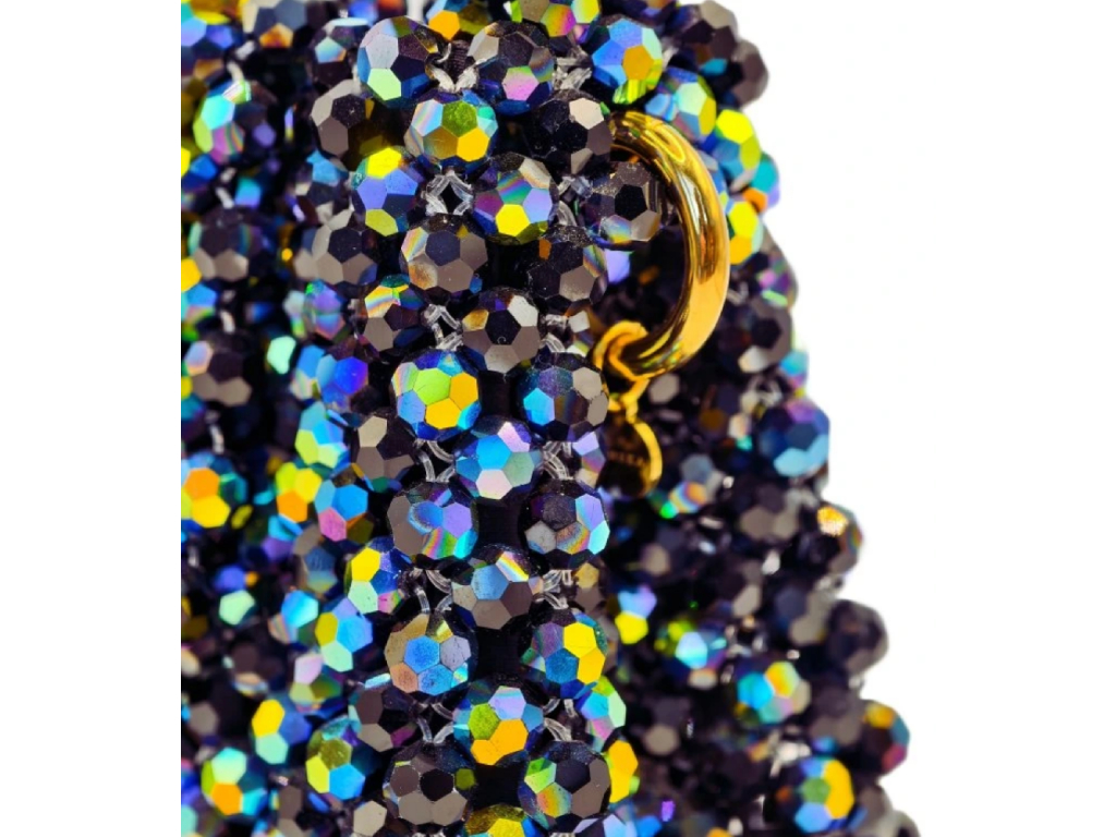 Realizzata a mano con la tecnica di infilatura e serraggio di circa 1200 perle Aurora (Jet Black AB). La produzione richiede 14 ore e la massima precisione. All'interno, un inserto con tasca in seta nera.