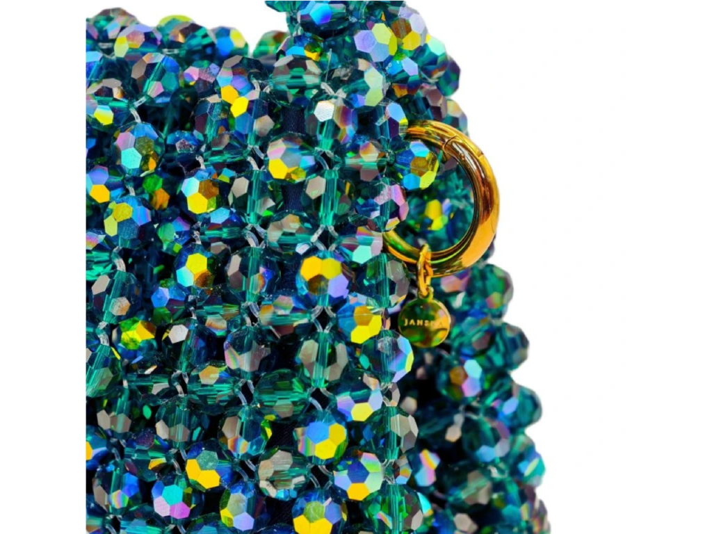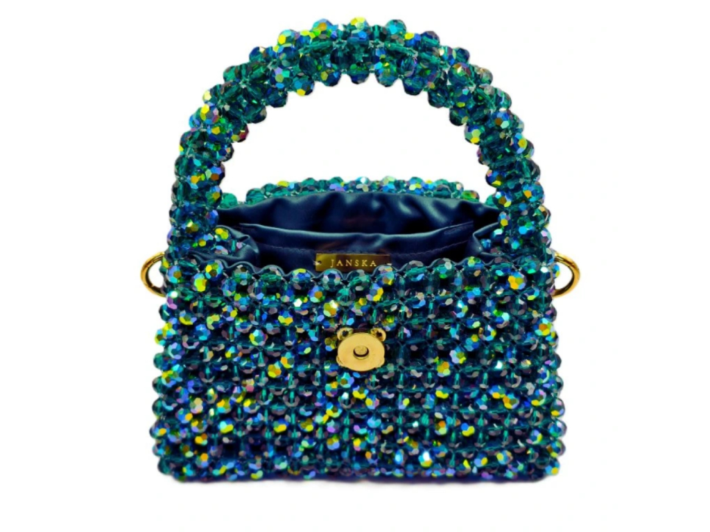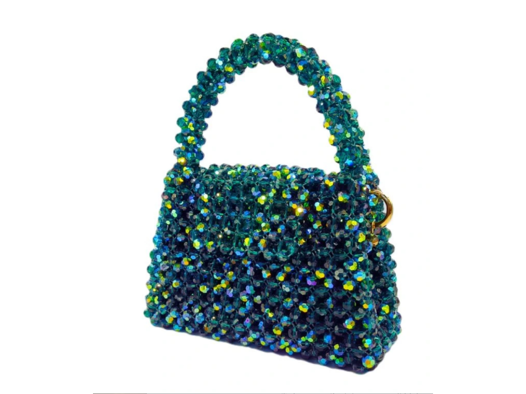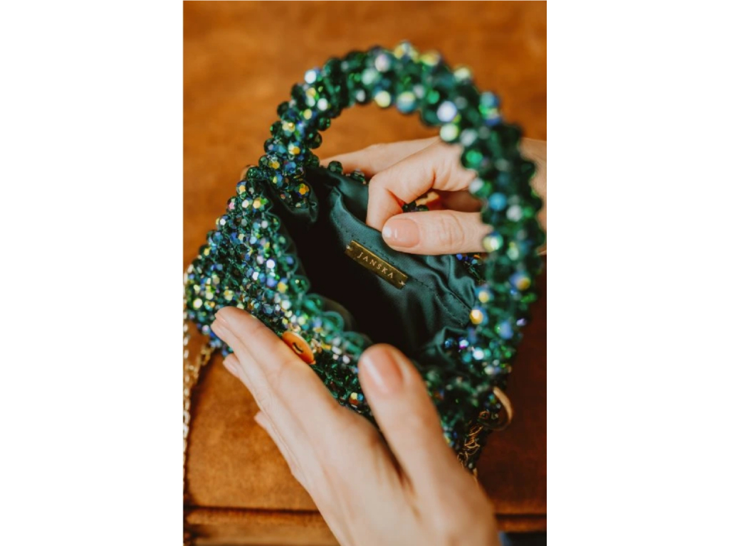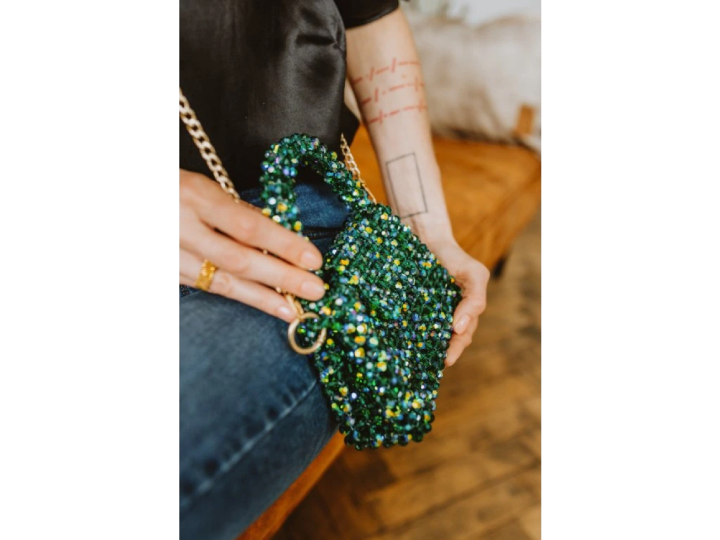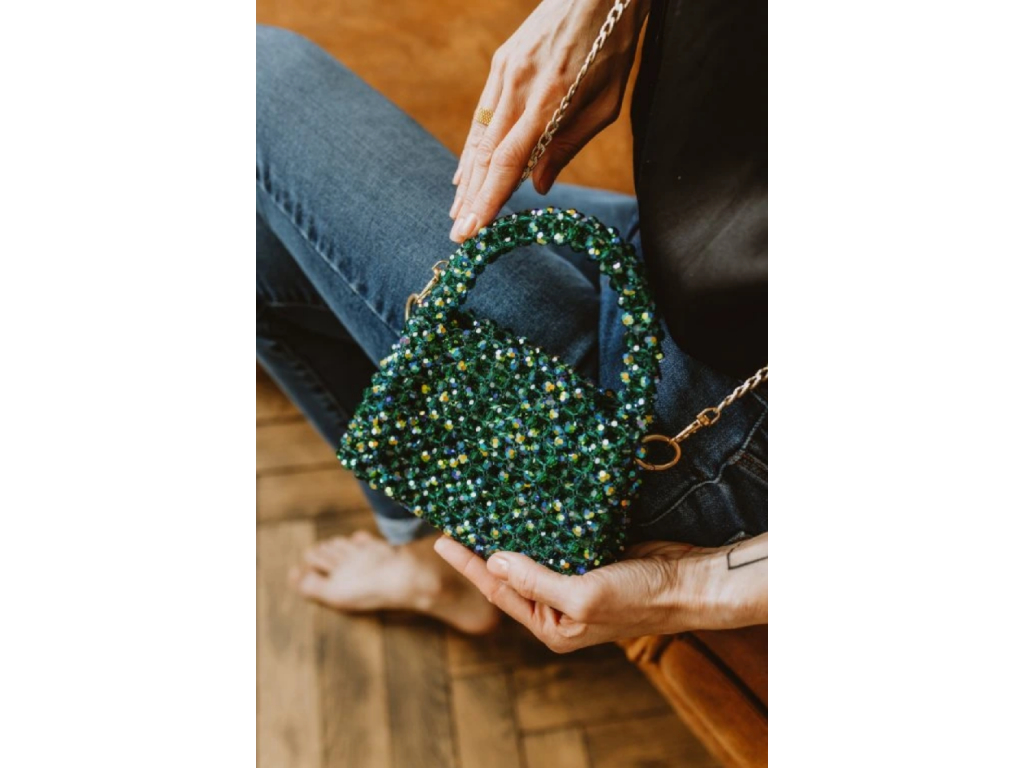 Borsa a mano nella tonalità Smeraldo AB con delicati riflessi dorati e comoda impugnatura. Realizzata a mano con circa 1200 perle tagliate utilizzando la tecnica dell'infilatura e del serraggio. Interno in raso verde con tasca. Dimensioni ideali per carte, contanti, chiavi, cuffie e rossetto.